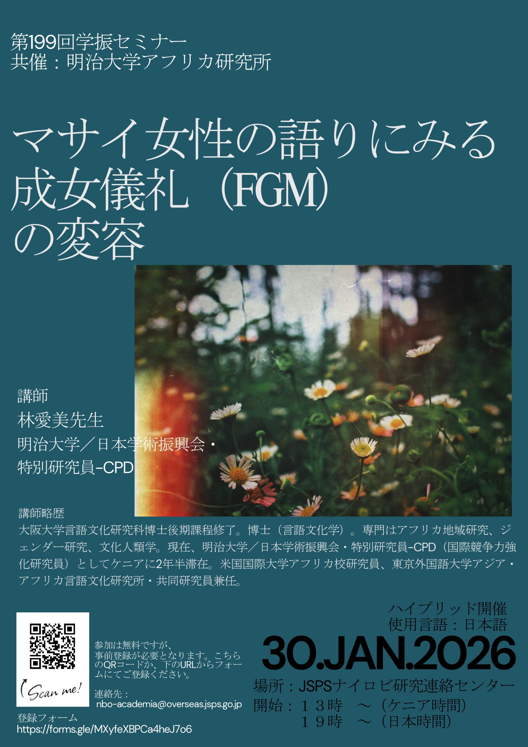 この度、第199回ナイロビ学振セミナー(ハイブリッド形式)を開催する運びとなりました。みなさまのご参加を心よりお待ち申し上げております。本セミナーでは、マサイ社会における成女儀礼(FGM)をめぐる女性たちの語りに焦点を当て、文化変容とジェンダーの視点から考察します。